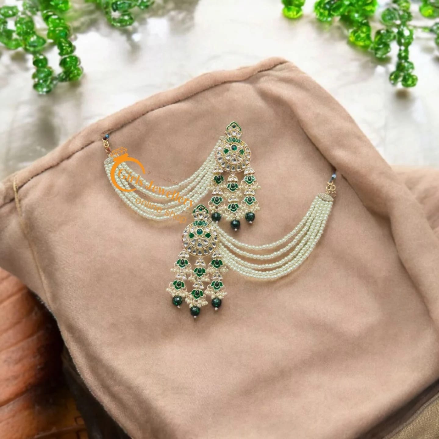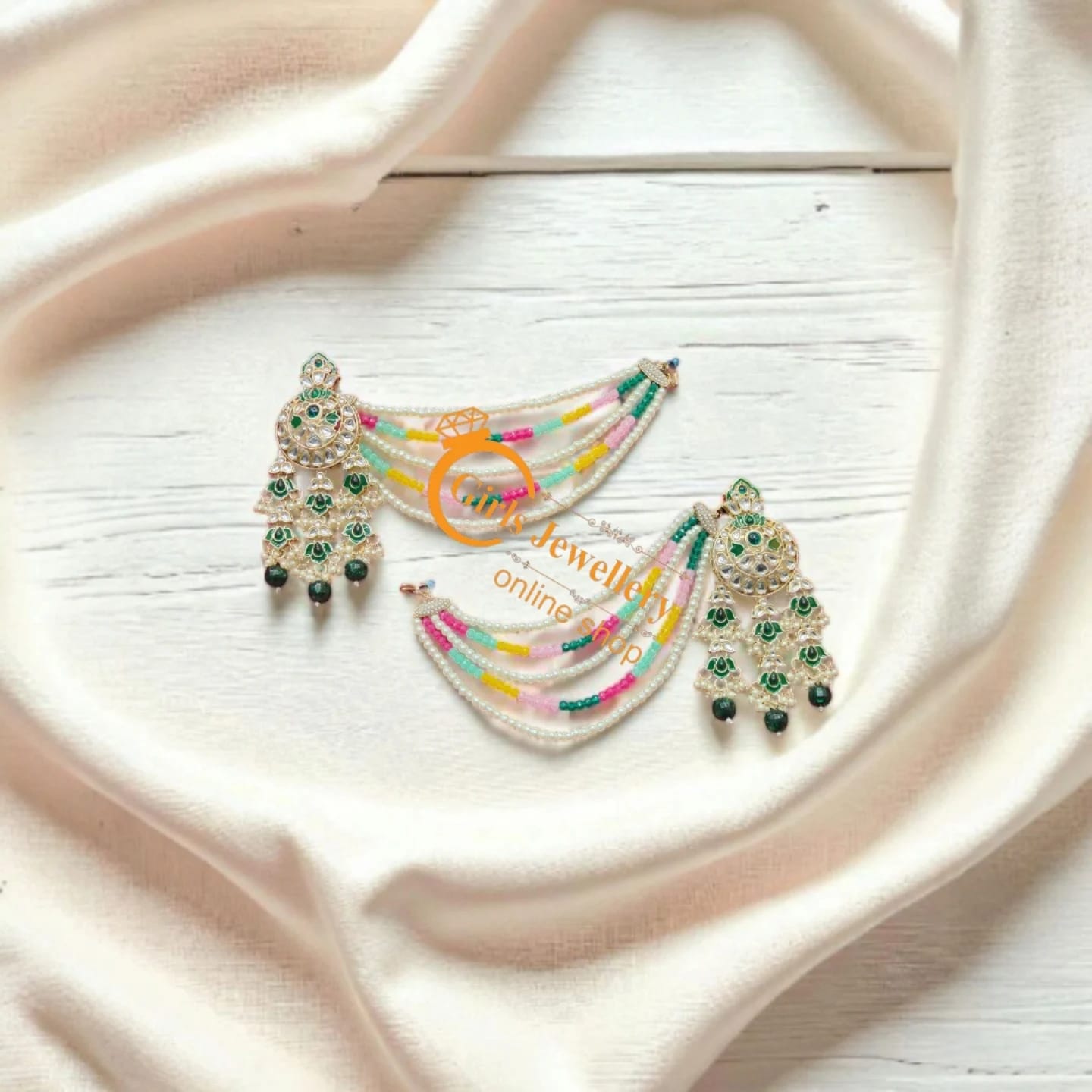Elegant Multicolor Ear Chains with Antique Green Jhumkas – Perfect for Traditional Looks