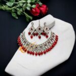 Pearl Drop Bridal Necklace Set (Featuring red and white stones with intricate gold-toned detailing and matching jhumka earrings) ₹899.00 Original price was: ₹899.00.₹499.00Current price is: ₹499.00.